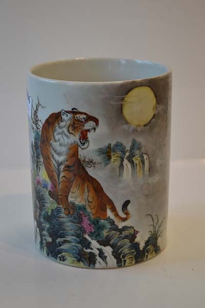 JAPANESE HAND PAINTED BRUSH POT WITH TIGER ILLUSTRATION