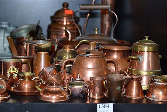 PART SHELF OF COPPER INCLUDING ART NOUVEAU VASE, CAULDRON, JUGS, BOTTLE, ETC.