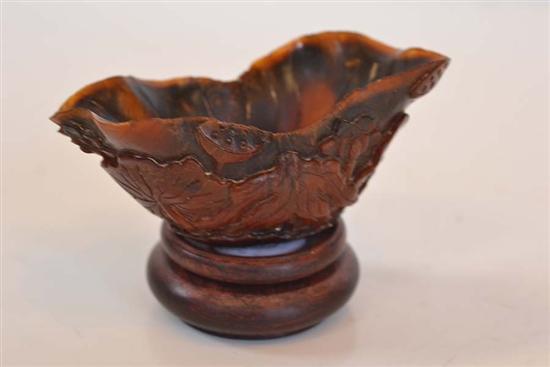 CHINESE CARVED HORN BOWL WITH LILY PAD DECORATION ON STAND