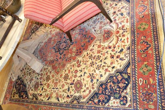 A LARGE PERSIAN HALI RUG IN CREAM, BLUE AND RED TONES