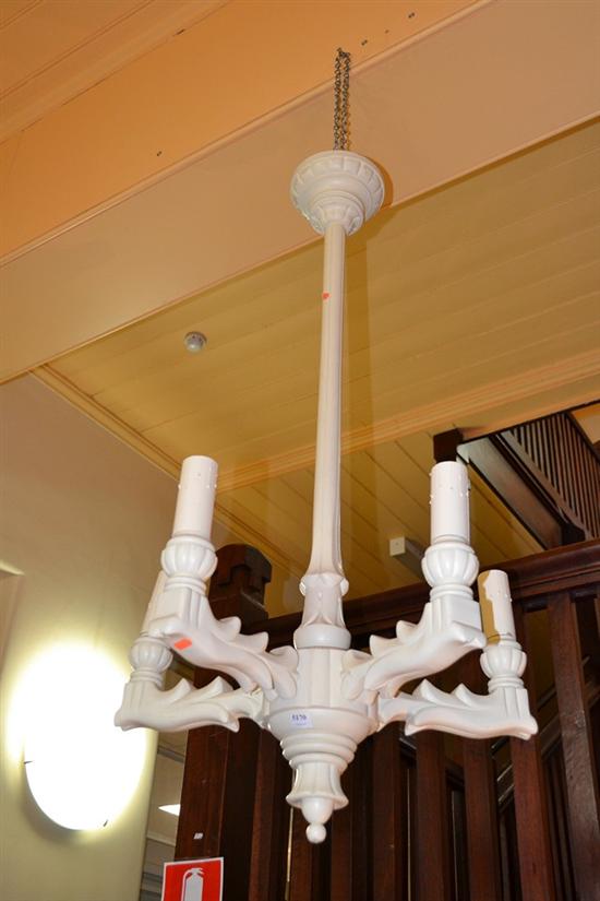 A TIMBER FIVE BRANCH HANGING LIGHT AND A WHITE ART DECO STYLE LAMP SHADE