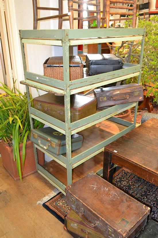 A FIVE TIER INDUSTRIAL SHELVING UNIT ON CASTORS