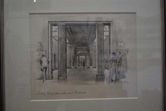 M MATTHEWS, LOOKING THROUGH SOME OF THE MAIN GALLERIES, PENCIL ON PAPER WITH PORTRAIT SKETCH ON REVERSE.