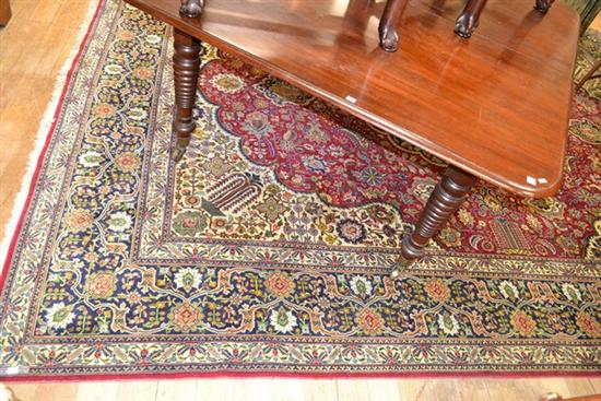 A LARGE WOOLEN PERSIAN CARPET ON A CREAM FIELD WITH RED, BLUE AND GREEN TONES