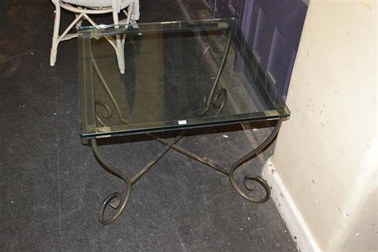 A WROUGHT IRON SQUARE GLASS TOPPED COFFEE TABLE