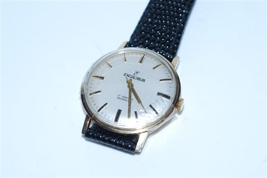 A GENTS EXCALIBUR AUTOMATIC WRISTWATCH TO 14CT GOLD CASE AND LEATHER BANDS