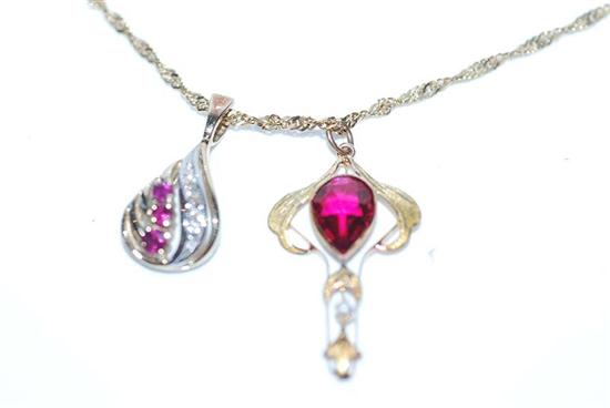 AN EDWARDIAN PENDANT TOGETHER WITH A 9CT GOLD RUBY AND DIAMOND PENDANT ON A GOLD PLATED CHAIN