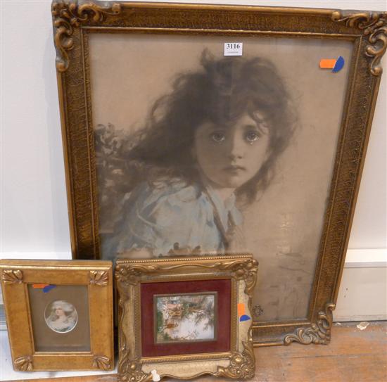A PAIR OF MINIATURE WORKS AND A REPRODUCTION PORTRAIT IN DECORATIVE FRAME
