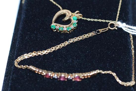A PINK SAPPHIRE AND DIAMOND BRACELET TOGETHER WITH AN EMERALD AND DIAMOND PENDANT IN 14CT GOLD