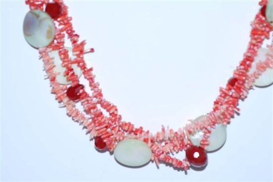 A CORAL AND MOTHER OF PEARL MULTI-STRAND NECKLACE