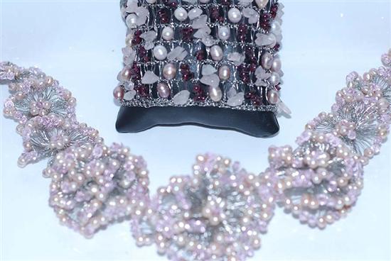 A FLORAL STYLE WIRE AND FRESHWATER PEARL MULTI CLUSTER NECKLACE TOGETHER WITH A CONFORMING CUFF BRACELET