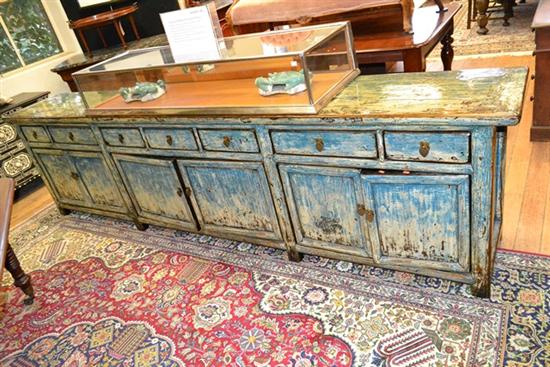 A LARGE RUSTIC PAINTED ORIENTAL SIDE BOARD WITH SIX DOORS AND SEVEN DRAWERS