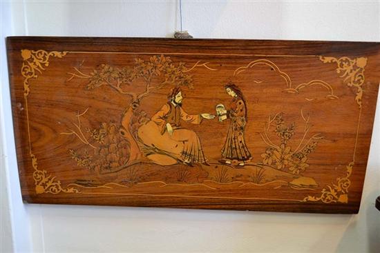 A CONTINENTAL IVORY INLAID WOOD PANEL WITH ARABESQUE SCENE