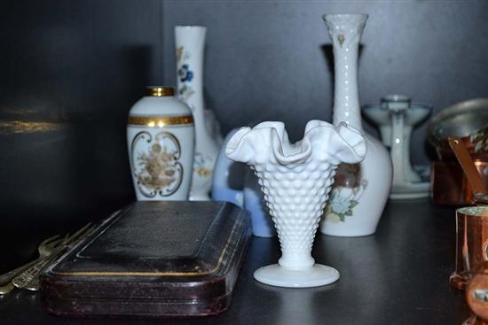 PART SHELF INCLUDING SMALL LIMOGES VASE, CLOISONNE BOX, FENTON VASE, VICTORIAN CASED THREE PIECE CHRISTENING SET ETC
