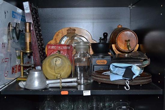 ONE SHELF INCLUDING ART DECO CLOCK (FAULT) ABBACUS, SHIPS BELL, FREE MASONS PARAPHERNALIA, MICROSCOPE, FIRE ALARM ETC