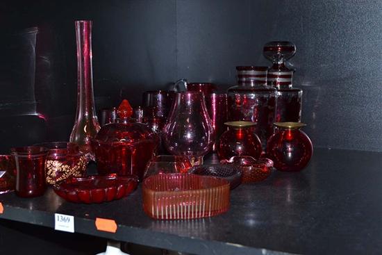 ONE SHELF OF RUBY GLASS INCLUDING JUGS, BEAKERS, DISHES, ETC.