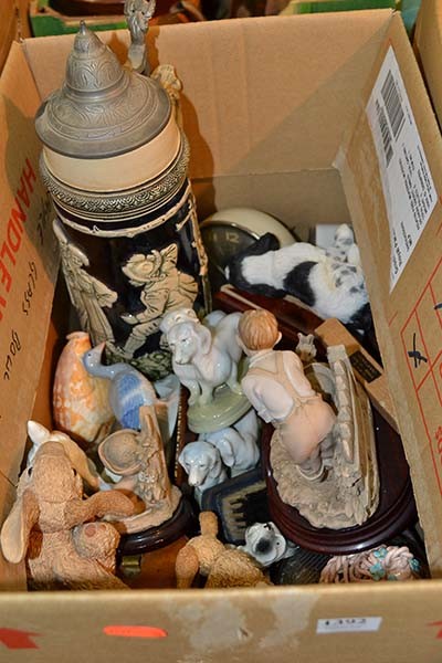 ONE BOX OF ASSORTED ITEMS INCLUDING FIGURES, FLATWARE, GERMAN STEIN, WEIGHTS, ETC.