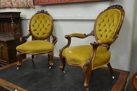 A VICTORIAN LADIES AND GENTS WALNUT CHAIR IN MUSTRARD BUTTON BACK UPHOLSTERY