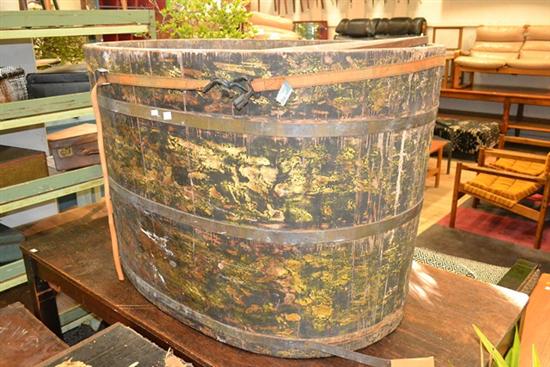 AN EARLY 20TH CENTURY TIMBER AND METAL MOUNTED BATH TUB WITH BRASS TAP