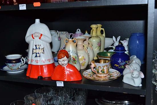 ONE SHELF OF CHINA INCL. MOORCROFT CORNFLOWER BLUE VASE, FIGURAL DECANTER, VASES, TEA WARE, CAPODIMONTE DEMI TASSE ETC