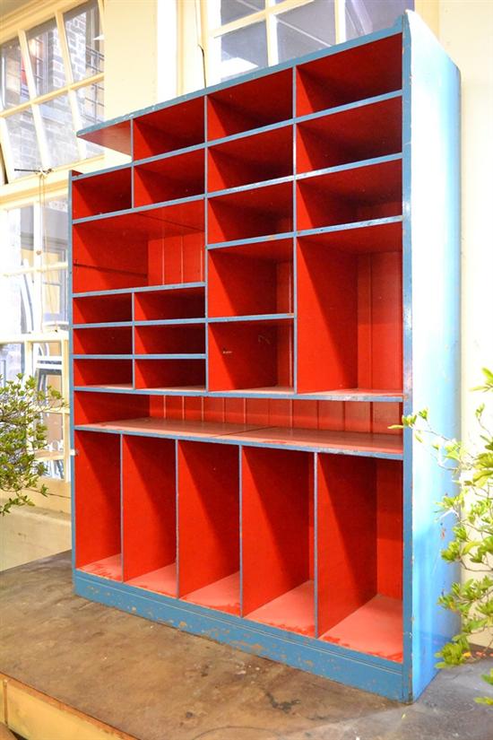 A RED AND BLUE PAINTED INDUSTRIAL SHELF