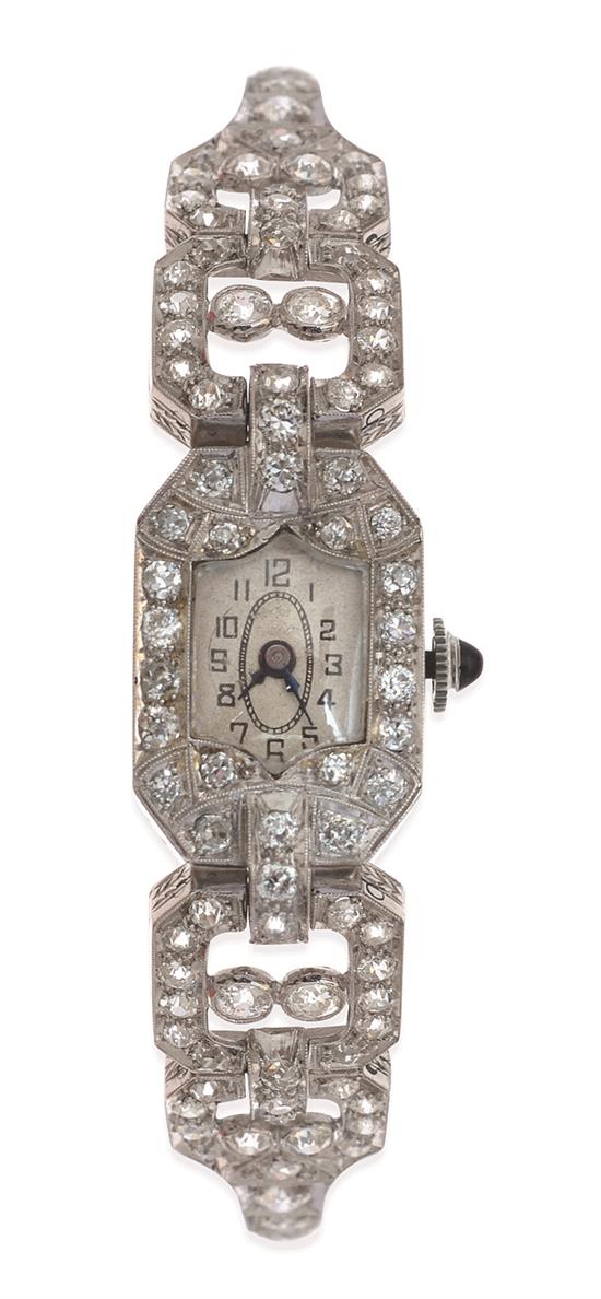 Manual wind movement, rectangular dial with Arabic numerals, diamond set case, lugs and bands in platinum and 18ct white gold, total diamond weight 4.45cts, total length 160mm.