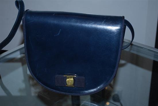 A HANDBAG BY FERRAGAMO IN NAVY LEATHER WITH GROSGRAIN GOLD METAL BOW FEATURE.