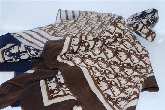 TWO VINTAGE SIGNATURE DIOR SCARVES ONE IN NAVY THE OTHER IN BROWN AND BEIGE TONES WITH A HANDKERCHIEF IN A CONFORMING DESIGN