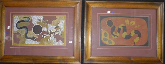 TWO WORKS; ARTIST UNKNOWN, SNAKE AND GOANNA WITH WATERHOLE, TOGETHER WITH SNAKE AND WATERHOLE, ACRYLIC ON CANVAS (2)