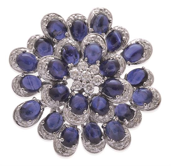 Of stylised floral design, set with sapphires cut en cabochon within diamond set borders around a central diamond cluster, in 18ct white gold, with papers.