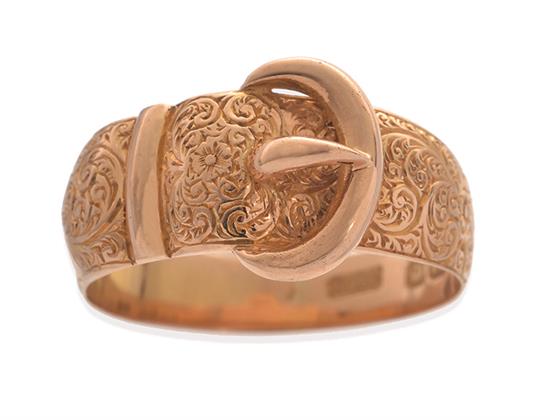The finely engraved band with buckle feature, in 18ct gold, ring size Q-R.