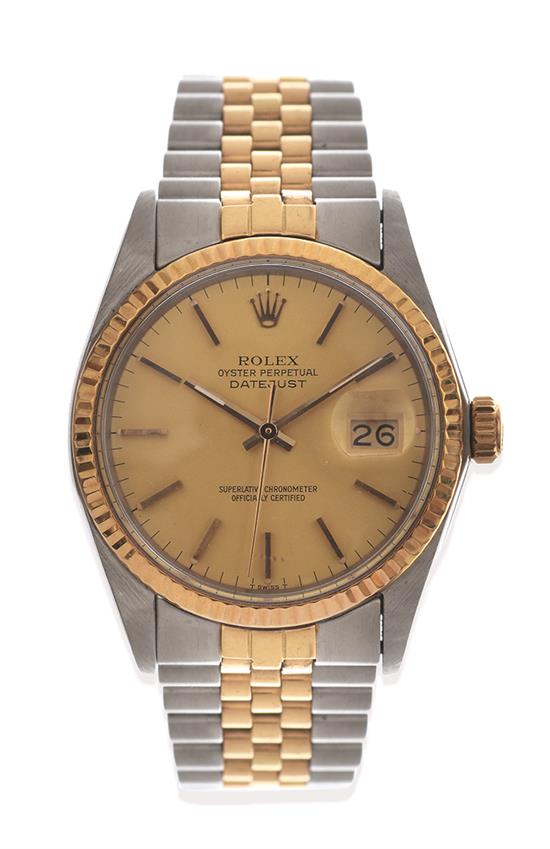 Automatic movement, circular gilded dial with raised baton numerals, date aperture at three, signed case, dial and movement, 18ct gold and stainless steel case and conforming bracelet bands, reference number 16000, serial number D0455234, calibre 3035, 36mm diameter.