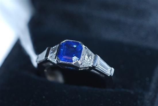 Centrally set with an octagonal sapphire weighing 1.04cts, flanked by a trapezoid and tapered baguette cut diamond to either side, altogether totalling 0.88cts, in platinum, ring size J-K.