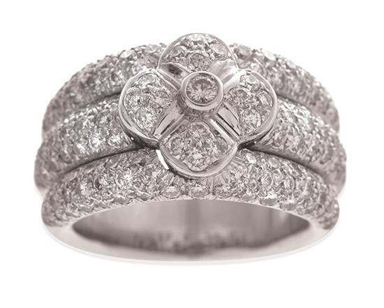 Comprising three bands pave set with round brilliant cut diamonds, with a central diamond set floral feature, altogether totaling 2.16cts, in 18ct white gold, ring size N-O.