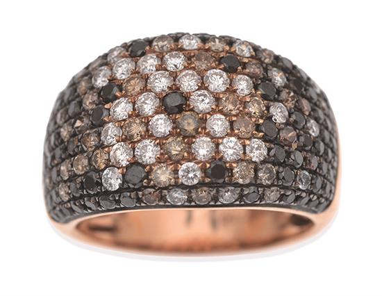 The wide band pave set with black, white and cognac diamonds, altogether totalling 2.43cts, in 18ct rose gold, independent valuation available, ring size N-O.