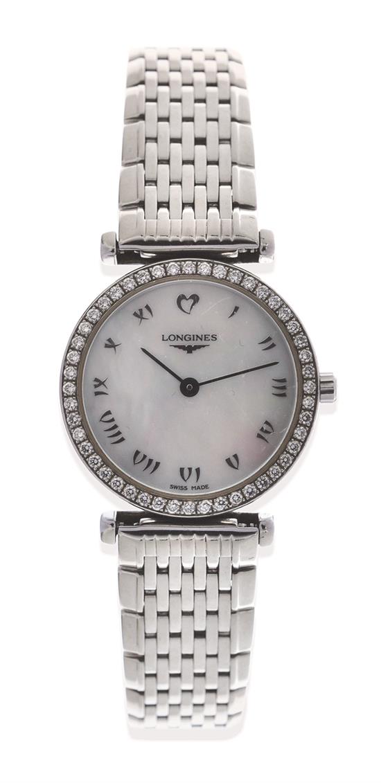 Le Grande Classique de Longines, quartz movement, circular mother of pearl dial with Roman numerals, diamond set stainless steel case and conforming bracelet bands, reference L42410/33748355, 23mm diameter, with box papers and extra links.
