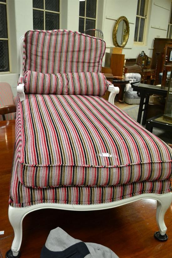 A PINK STRIPED CHAISE LOUNGE WITH RATTAN BACK