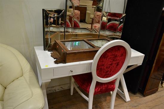 CONTEMPORARY WHITE DRESSING TABLE WITH BEVELLED SECTIONAL MIRROR AND UPHOLSTERED CHAIR