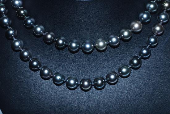 A STRAND OF TAHITIAN PEARLS - Comprising seventy six pearls of grey green and silver hues, measuring 9.0mm to 10.0mm, to a ball clasp in two tone 14ct white gold, total length 830mm.