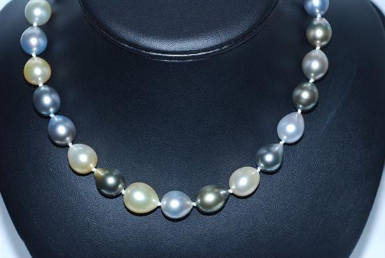A STRAND OF MULTI-COLOURED SOUTH SEA PEARLS - Comprising twenty seven semi-baroque pearls of grey, green and golden hues, measuring 10.5mm to 13.3mm, to a ball clasp in two tone 14ct white gold, total length 410mm.