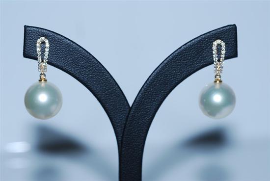 A PAIR OF SOUTH SEA PEARL AND DIAMOND EARRINGS - Each earring comprising a round pearl of creamy hues, measuring 13.0mm suspended on a split diamond set drop totalling 0.24cts, to a stud fitting in 18ct gold.