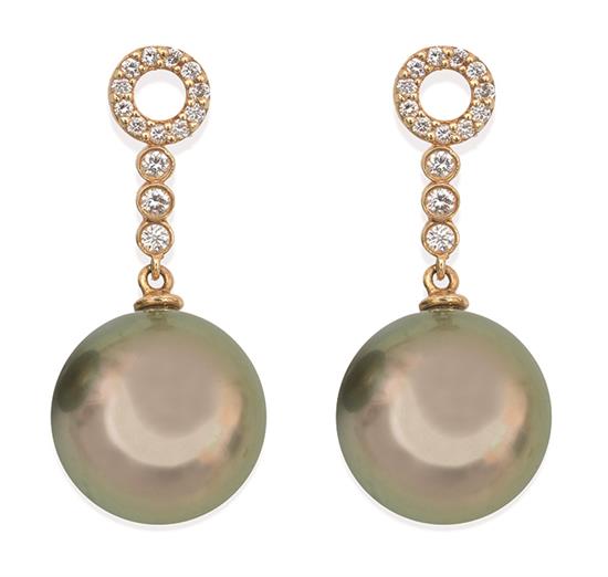A PAIR OF TAHITIAN PEARL AND DIAMOND EARRINGS