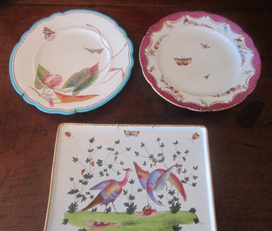 TWO 19TH CENTURY ENGLISH PORCELAIN PLATES, ONE PAINTED WITH INSECTS AND FLOWERS, POSSIBLY CHELSEA, 22.5 CM DIAMETER, THE OTHER BY POWELL AND BISHOP CIRCA 1870, 23.5CM DIAMETER AND A MODERN RECTANGULAR PORCELAIN WALL PLATE