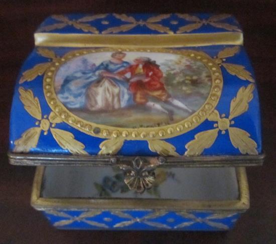 A FRENCH PORCELAIN HAND PAINTED AND GILT MINIATURE CASKET, 7CM WIDE