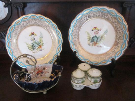 A COLLECTION OF PORCELAIN INCLUDING A ROYAL DOULTON CRUET SET, AN EP MOUNTED PORCELAIN SHELL BOWL AND A PAIR OF 19TH CENTURY CABINET PLATES