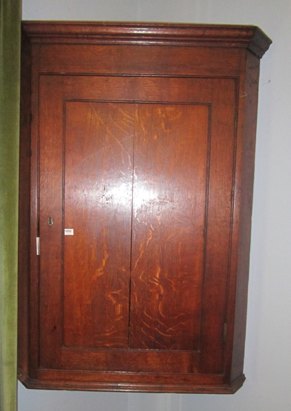 A GEORGE III OAK HANGING CORNER CABINET WITH THREE SHELVES, 77 X 104 X 48 CM