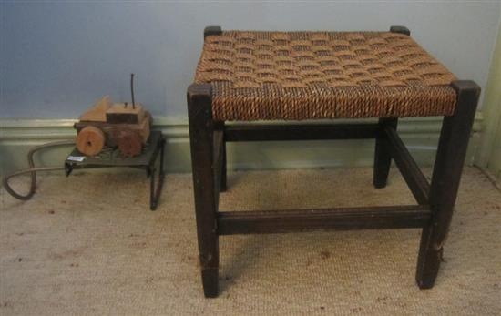 AN OAK FRAMED RUSH SEATED STOOL AND A BRASS TRIVET