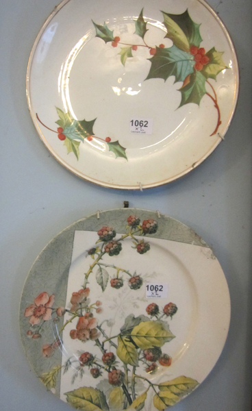 TWO WALL PLATES, ONE VICTORIAN, ONE PAINTED WITH HOLLY, THE OTHER WITH FRUIT