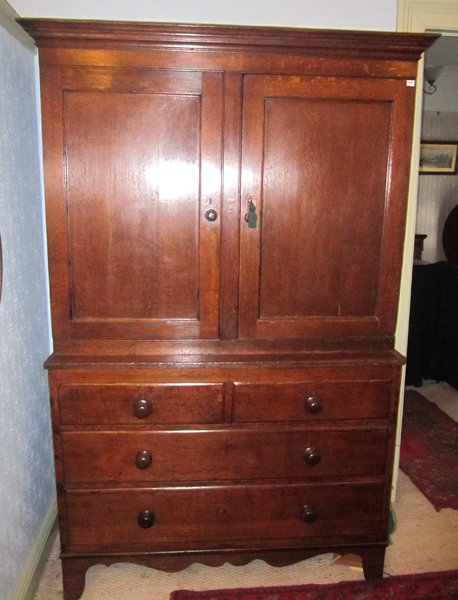 A GEORGE III OAK LINEN PRESS, WITH TWO DOORS AND FIVE DRAWERS, 120 X 194.5 X 51 CM