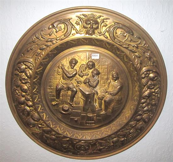 A CIRCULAR EMBOSSED BRASS WALL PLAQUE DEPICTING A TAVERN SCENE, 57.5 CM DIAMETER AND TWO SMALLER EMBOSSED BRASS PLAQUES
